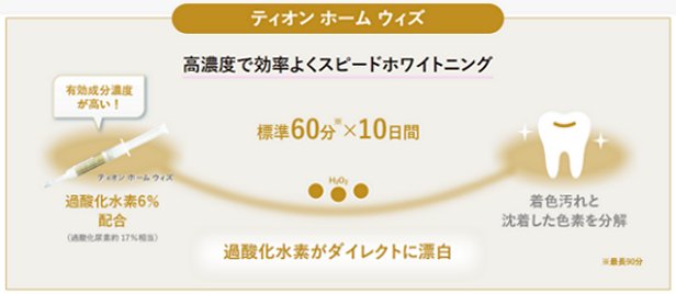 | ティオン ホーム ウィズは短期間で実感できる高濃度ホームホワイトニングジェル。独自のジェル処方と高い有効成分濃度により、1日1回で標準60分(最長90分まで)×10日間で、ご自宅でのホワイトニングを可能に。スピーディーさ重視の方や経験者の方に最適です。 | |